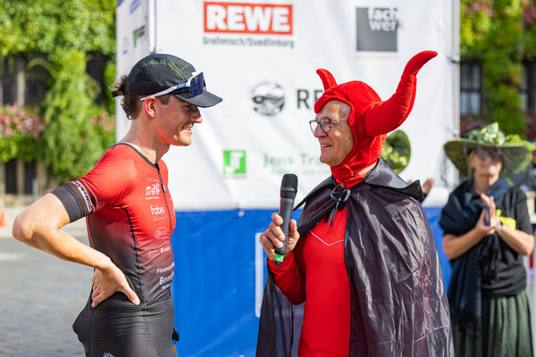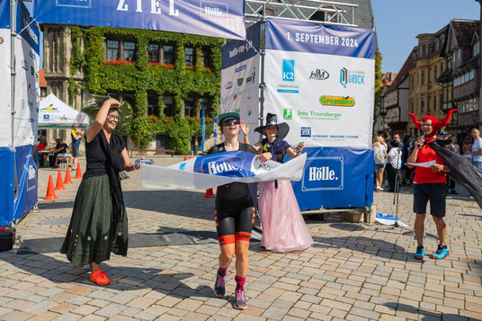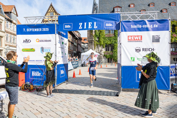 44 Sekunden. Um diese Zeit war der neue Sieger in der Einzelkonkurrenz schneller als die bisherige Bestzeit. Nach 2 km schwimmen, 83 km Rad und einem Halbmarathon ist das eigentlich nur ein Wimpernschlag – herzlichen Glückwunsch an einen stark auftrumpfenden Tom Holzmann, der für den Sponsoren REWE und seinen Verein LLG Wonnegau startete. Mit seinen 4:06:11 hat er fast 10 Minuten auf den zweiten, Philipp Widmann (TV Barchfeld) herausgelaufen. Lars Heppner (ebenfalls REWE und Nine Sub9) kam als Dritter ins Ziel. Insgesamt kam das Rekordfeld von 176 Männern vor dem Rathaus der Welterbestadt Quedlinburg an – gestartet waren 180.