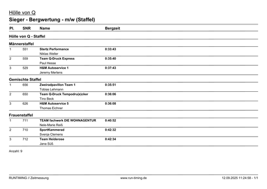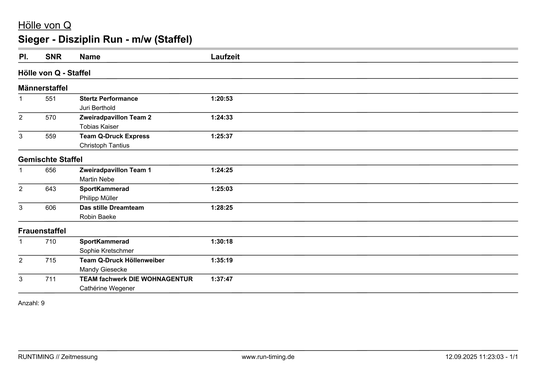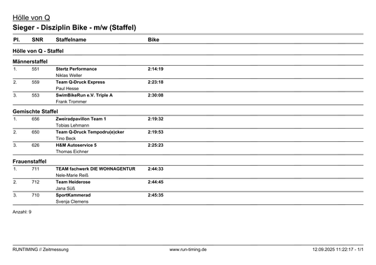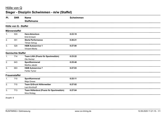 Die Staffeln wurden von mit renommierten Spezialisten besetzten Teams dominiert. So legte Elea Linka, erfolgreiche WM Teilnehmerin im Freiwasserschwimmerin, den Grundstein für den Sieg von „Stertz-Performance“ bei den gemischten Staffeln. Auch Radfahrer Niklas Weller und Läufer Richard Vogelsang waren jeweils die Besten in ihrer Kategorie und so kam das Team mit der schnellsten Zeit insgesamt ins Ziel. Erstmals lag mit 3:52:31 eine Siegzeit der Hölle von Q unter 4 Stunden!