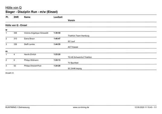 Insgesamt erreichten im Einzel 34 Frauen und 172 Männer sowie 114 Staffeln die Ziellinie. 550 Sportler waren dabei, ein neuer Rekord für die Hölle von Q. Beim Start, an der Radstrecke und im Ziel fanden sich jeweils mehrere Hundert Zuschauer ein und unterwegs gab es bei bestem Wettkampfwetter zahlreiche Stimmungsnester. Unter dem Motto „Nach der Hölle ist Vorhölle“ freut sich das Veranstalterteam auf die nächste Ausgabe der Hölle von Q am 1.9.2024. Die Anmeldung eröffnet am 15. Oktober über www.hoelle-von-q.de