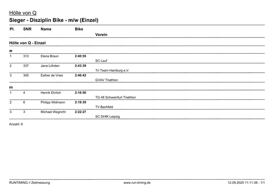 Livia Eggler (Schweiz) und Nico Markgraf heißen die Einzel Sieger bei der Hölle von Q, dem Mitteldistanztriathlon mit 1600 Höhenmetern im Harz. Nico wiederholte damit seinen Sieg aus dem Vorjahr. Auf der teilweise neuen Strecke blieb er mit 4:08:18 nur knapp über dem Streckenrekord. Frauensiegerin Livia hingegen unterbot mit 4:49:06 die bisherige Bestleistung gleich um fast 12 Minuten – und kann sich damit über eine zusätzliche Prämie von 500€ freuen. Mit der zweitplatzierten Tanja Tschech aus den USA stand eine weitere internationale Teilnehmerin auf dem Podest. Manuela Süß aus Dresden wurde Dritte und als beste Vertreterin der Triathlonverbände von Sachsen, Sachsen-Anhalt und Thüringen auch Mitteldeutsche Meisterin. Hinter Nico Markgraf zweiter bei den Männern wurde Timo Rippart gefolgt von Kenneth Warmuth aus Leipzig. Kenneth ist damit ebenfalls Mitteldeutscher Meister.